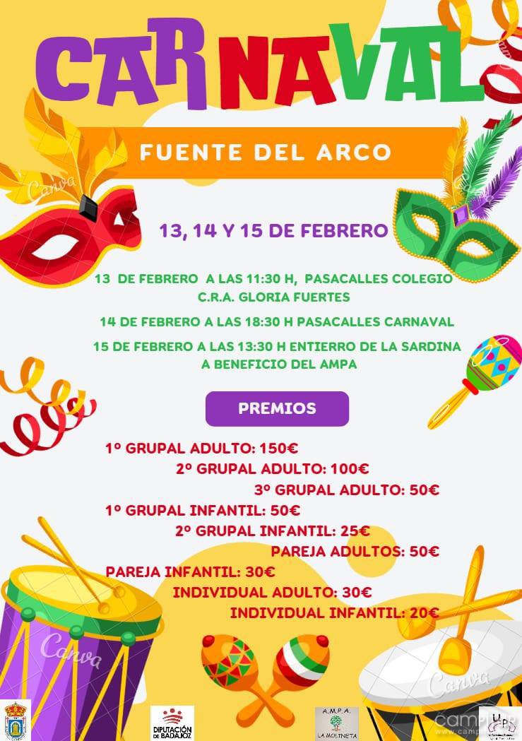 Fuente del Arco ya tiene lista su programación de Carnaval, una cita que llenará de color, disfraces y ambiente festivo las calles del municipio durante tres días: 13, 14 y 15 de febrero. El calendario arrancará con el público escolar y continuará con el pasacalles popular, para cerrar el sábado con el tradicional Entierro de la Sardina, que este año tendrá además un componente solidario, a beneficio del AMPA.